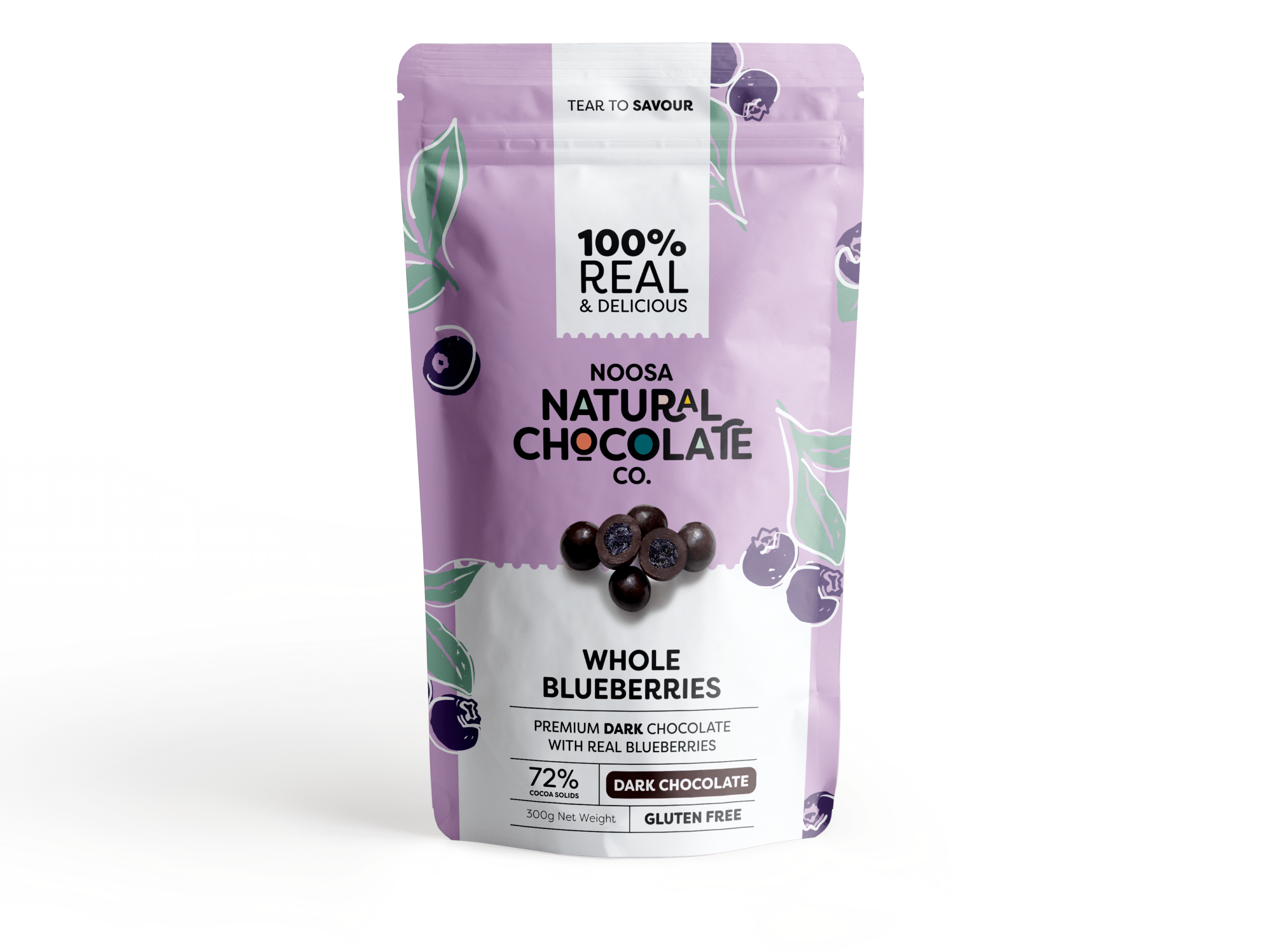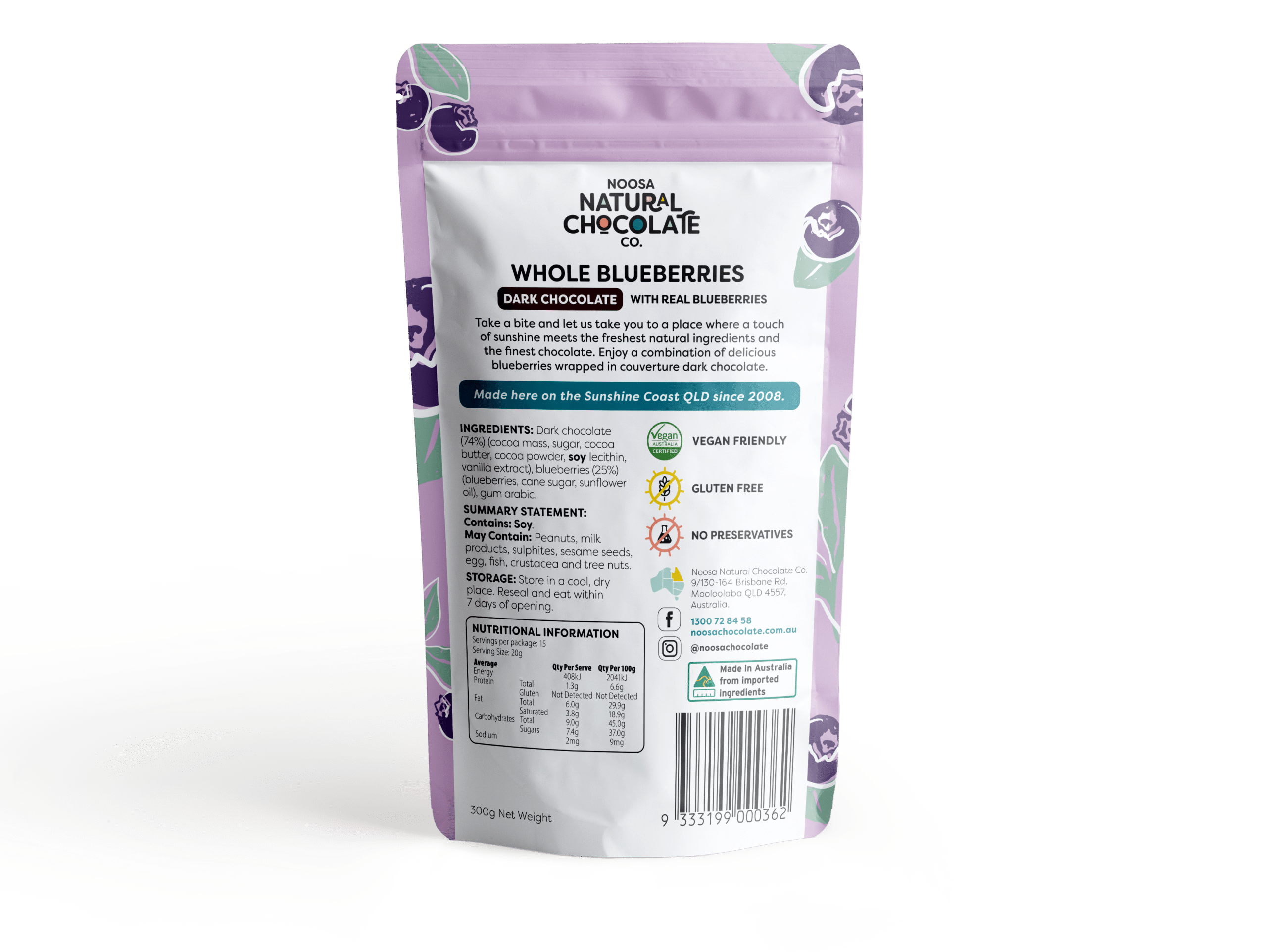 Dark chocolate (74%) (cocoa mass, sugar, cocoa powder, soy lecithin), blueberries (25%) (blueberries, cane sugar, sunflower oil), glazing agent.
