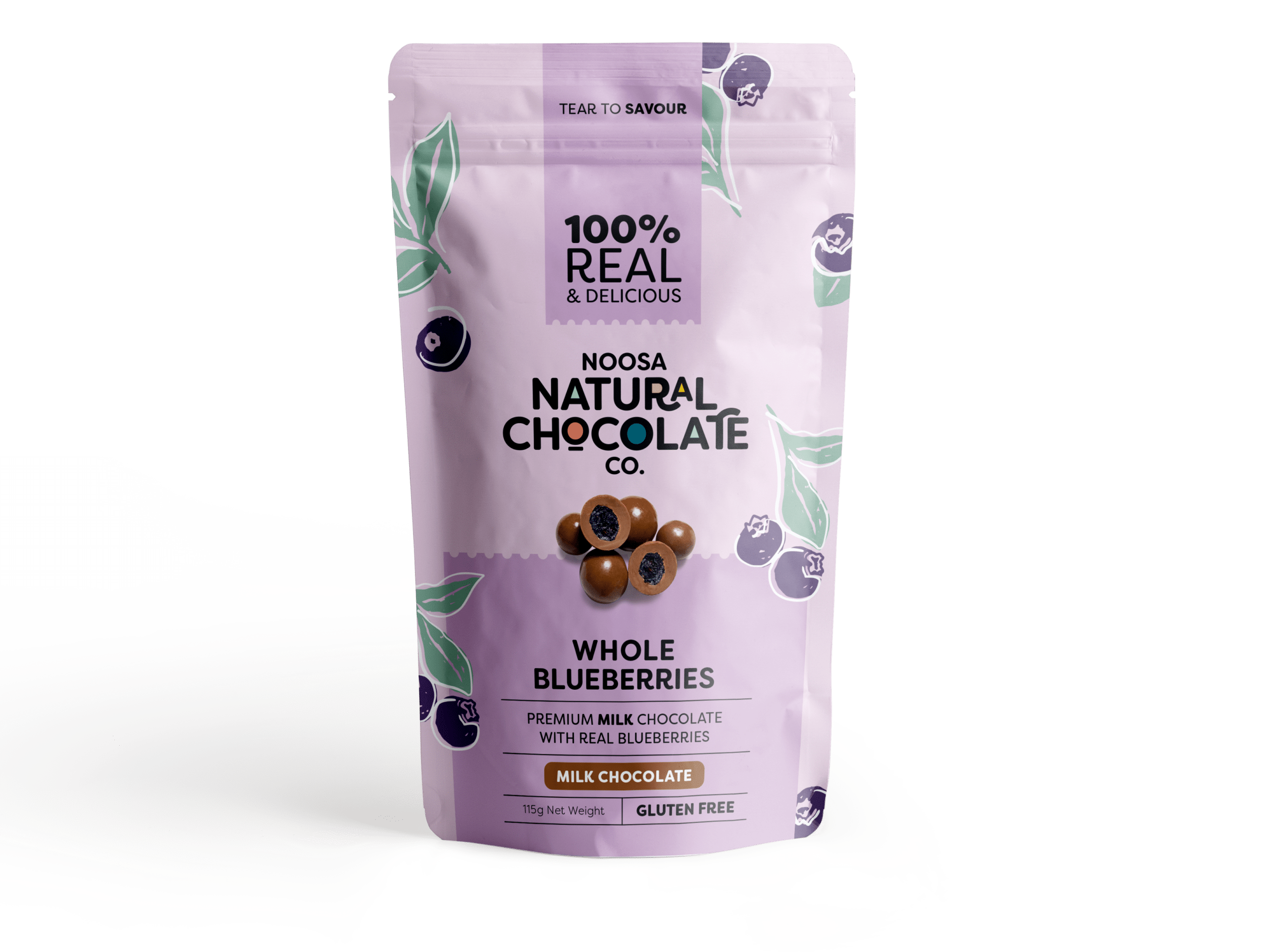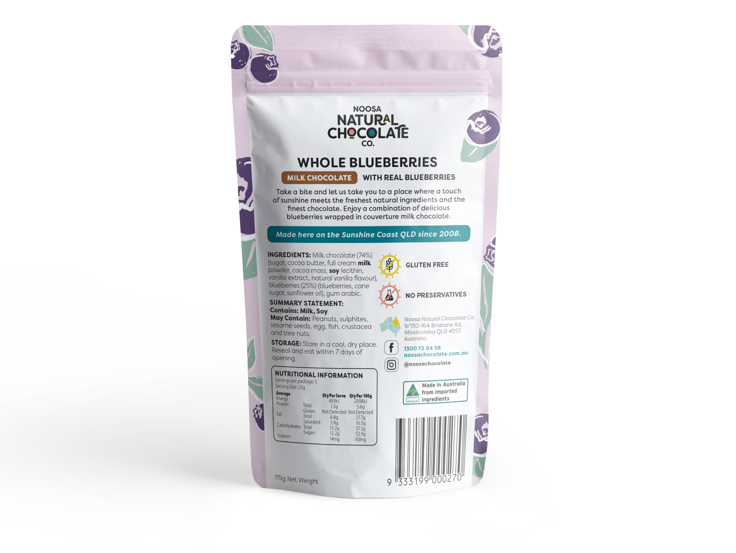 Milk Chocolate 74% (sugar, cocoa butter, milk solids, cocoa mass, soy lecithin, natural vanilla flavouring), blueberries 25% (blueberries, cane sugar, sunflower oil), glazing agent.