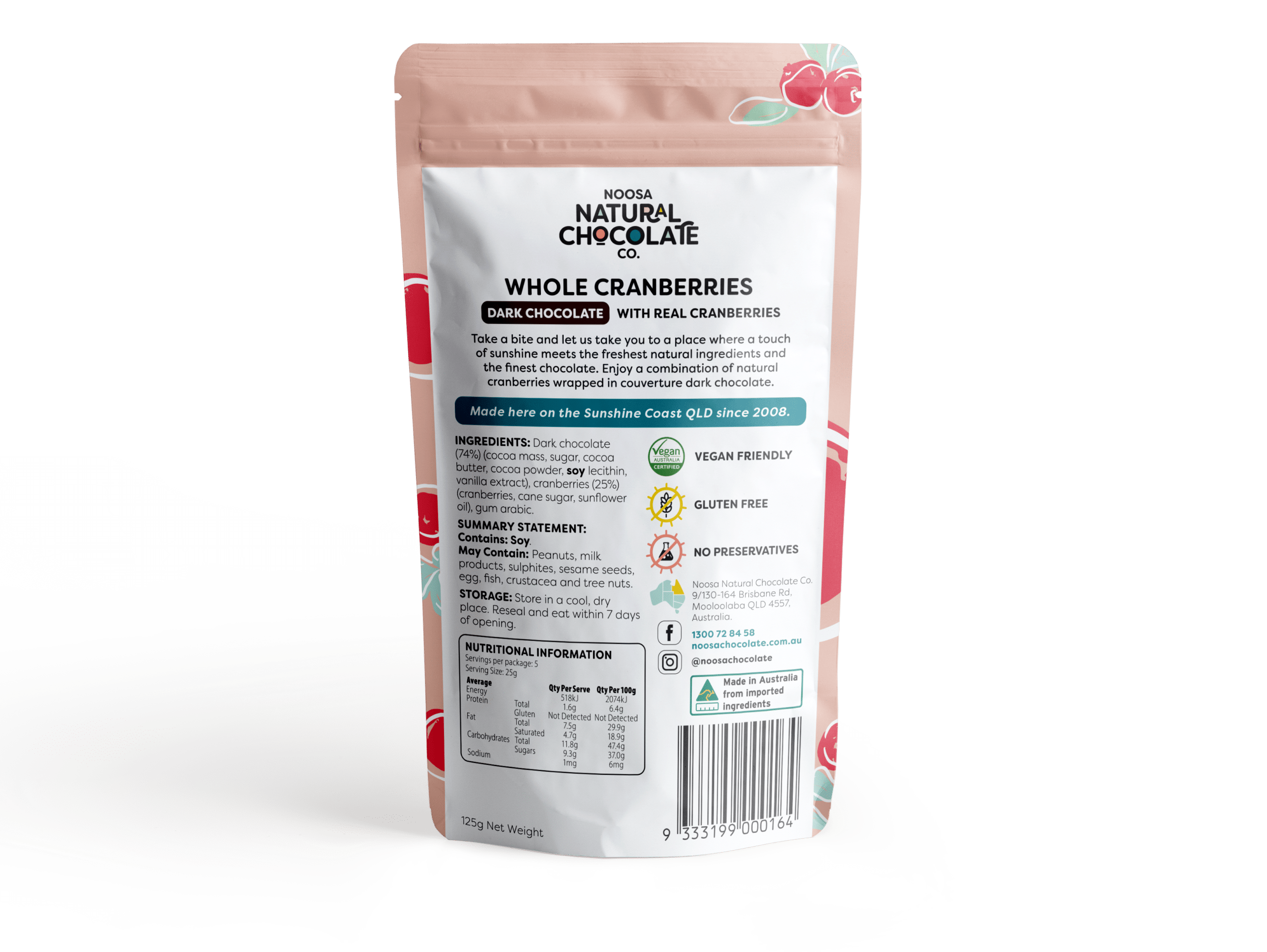 Dark chocolate (74%) (cocoa mass, sugar, cocoa powder, soy lecithin), cranberries (25%) (cranberries, cane sugar, sunflower oil), glazing agent.