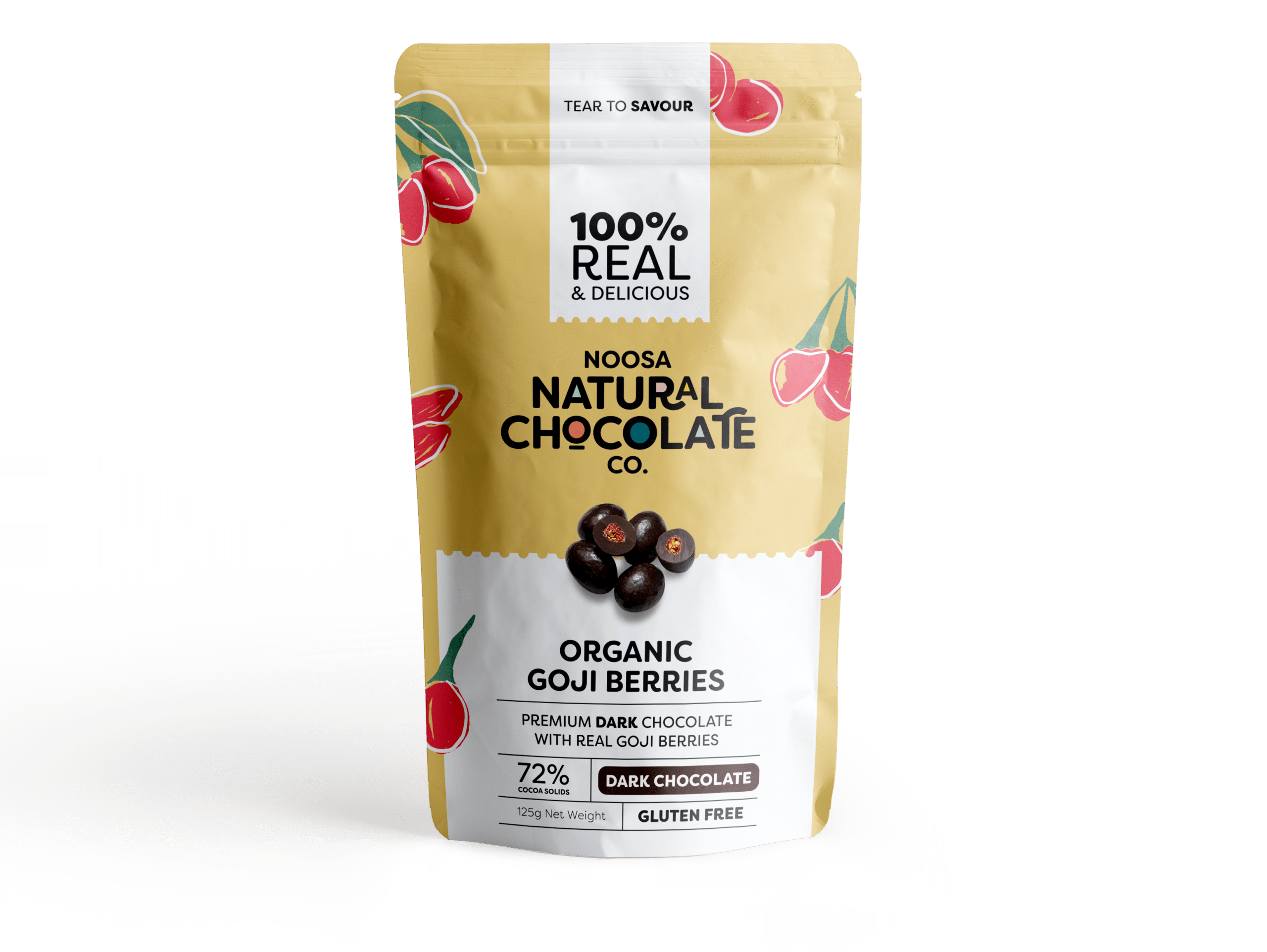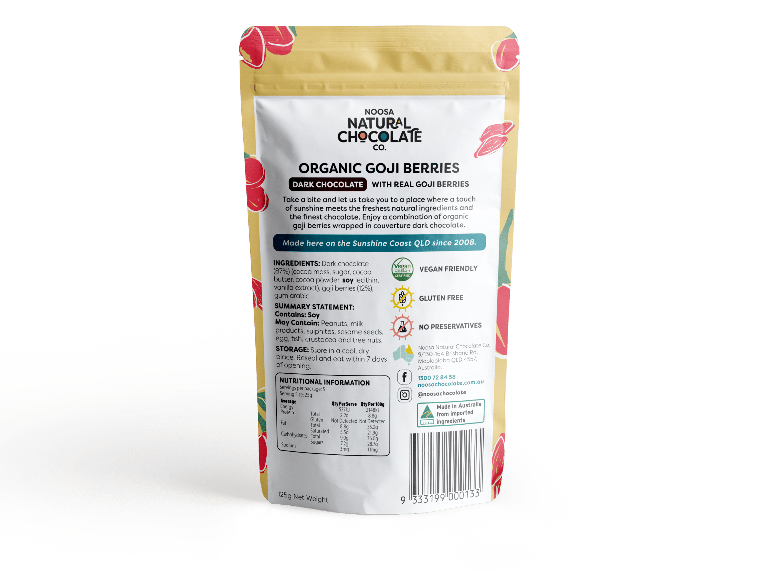 Dark chocolate (87%) (cocoa mass, sugar, cocoa powder, soy lecithin), goji berries (12%), glazing agent.