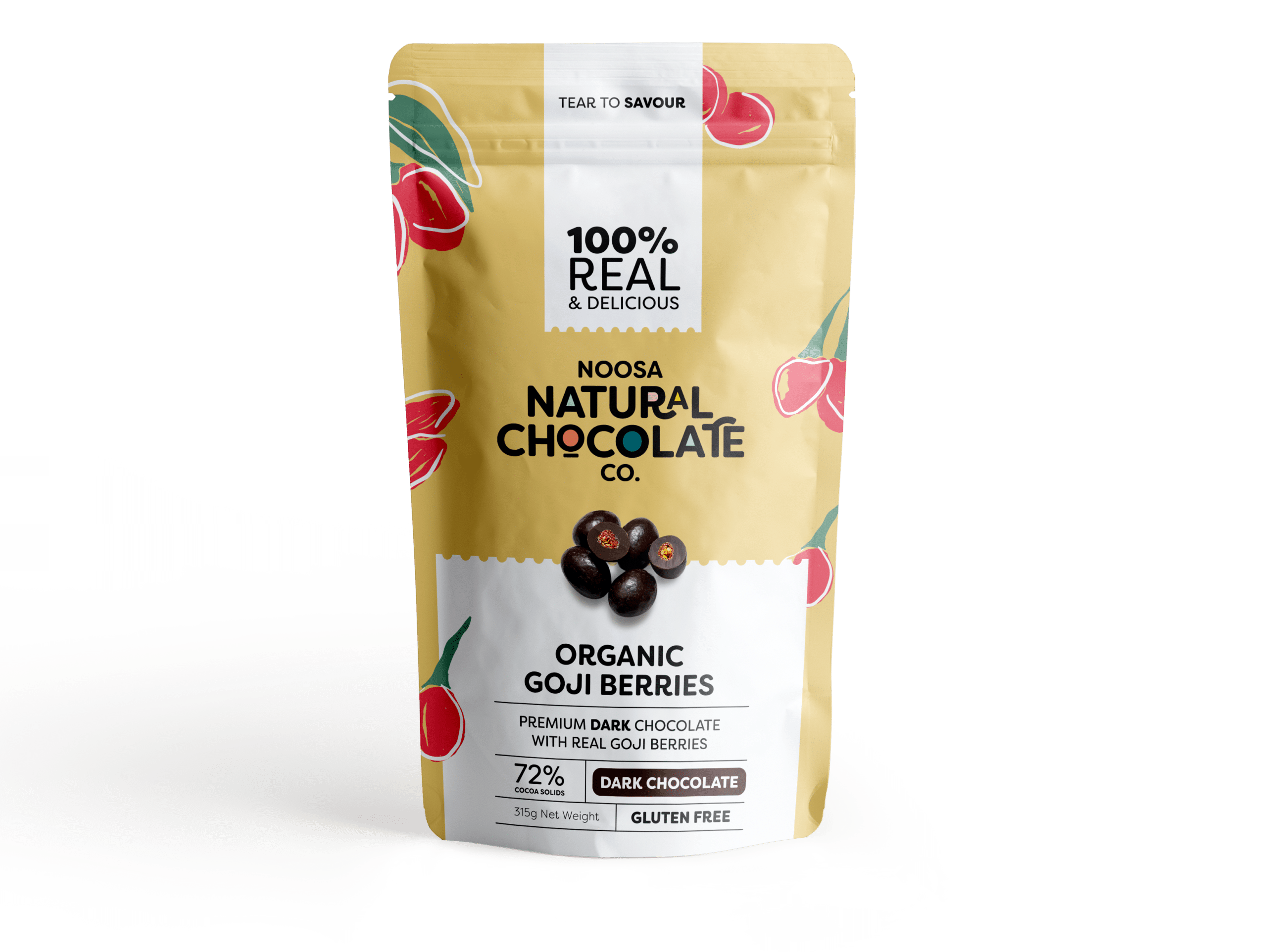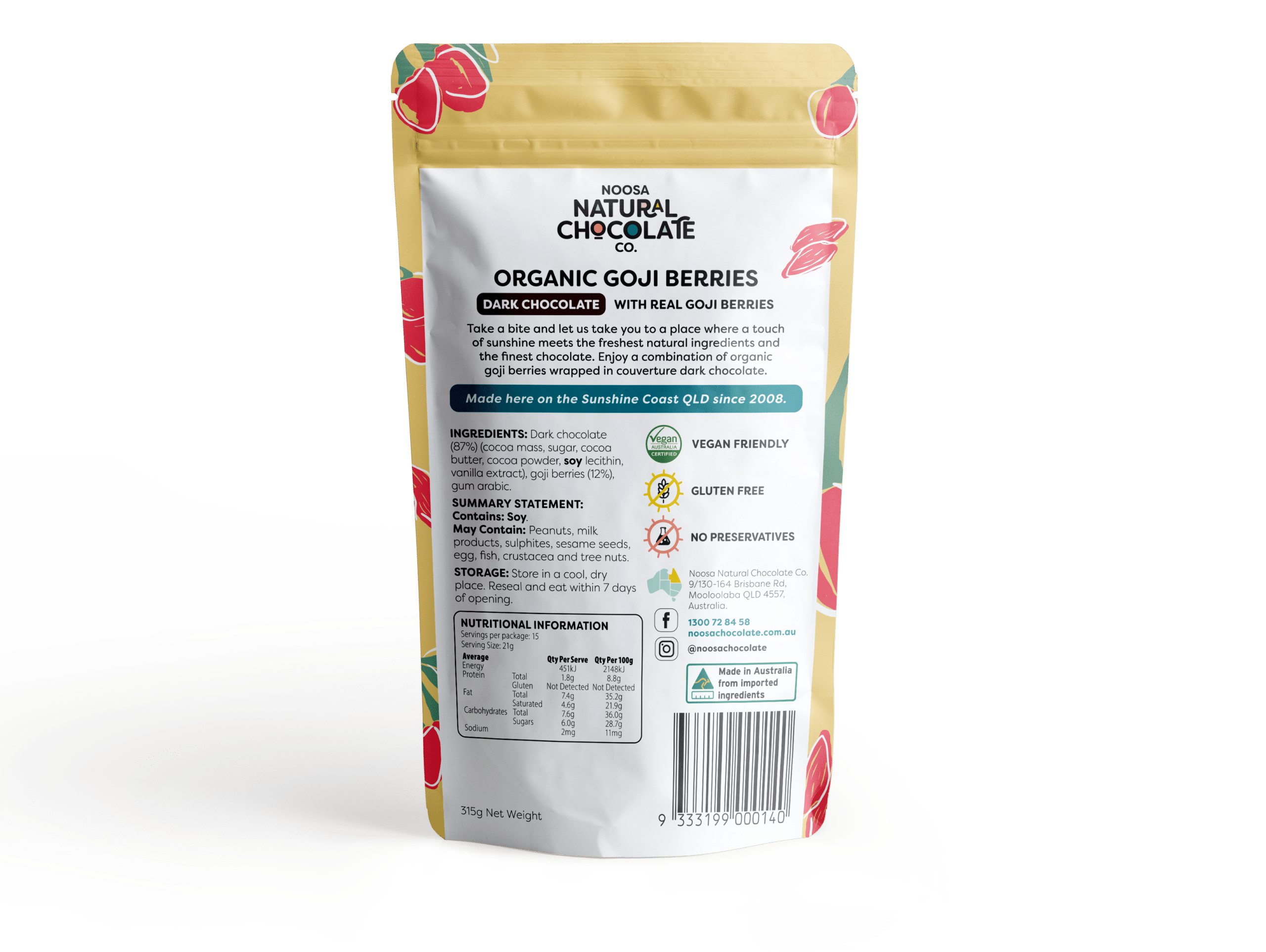 Dark chocolate (87%) (cocoa mass, sugar, cocoa powder, soy lecithin), goji berries (12%), glazing agent.