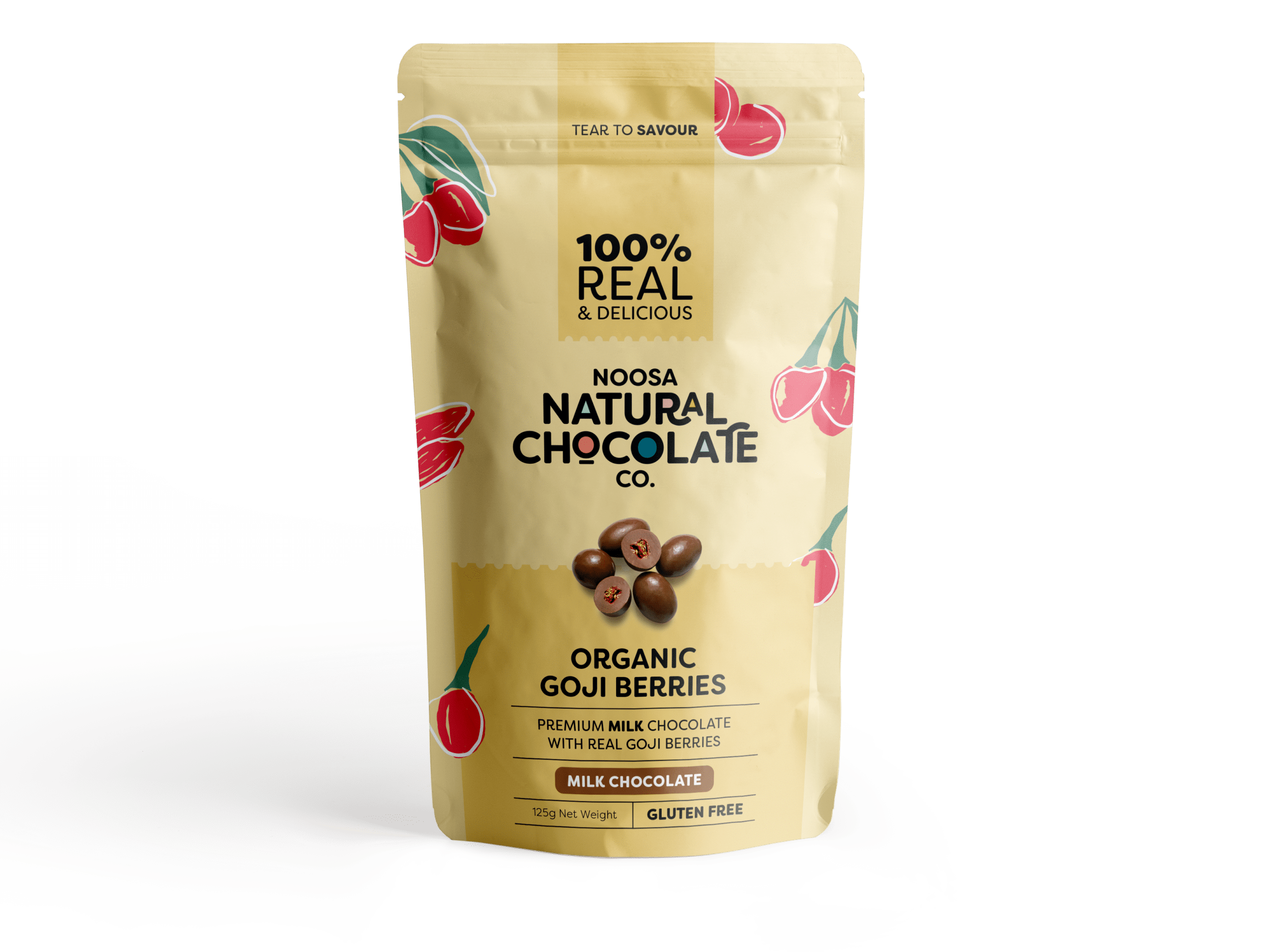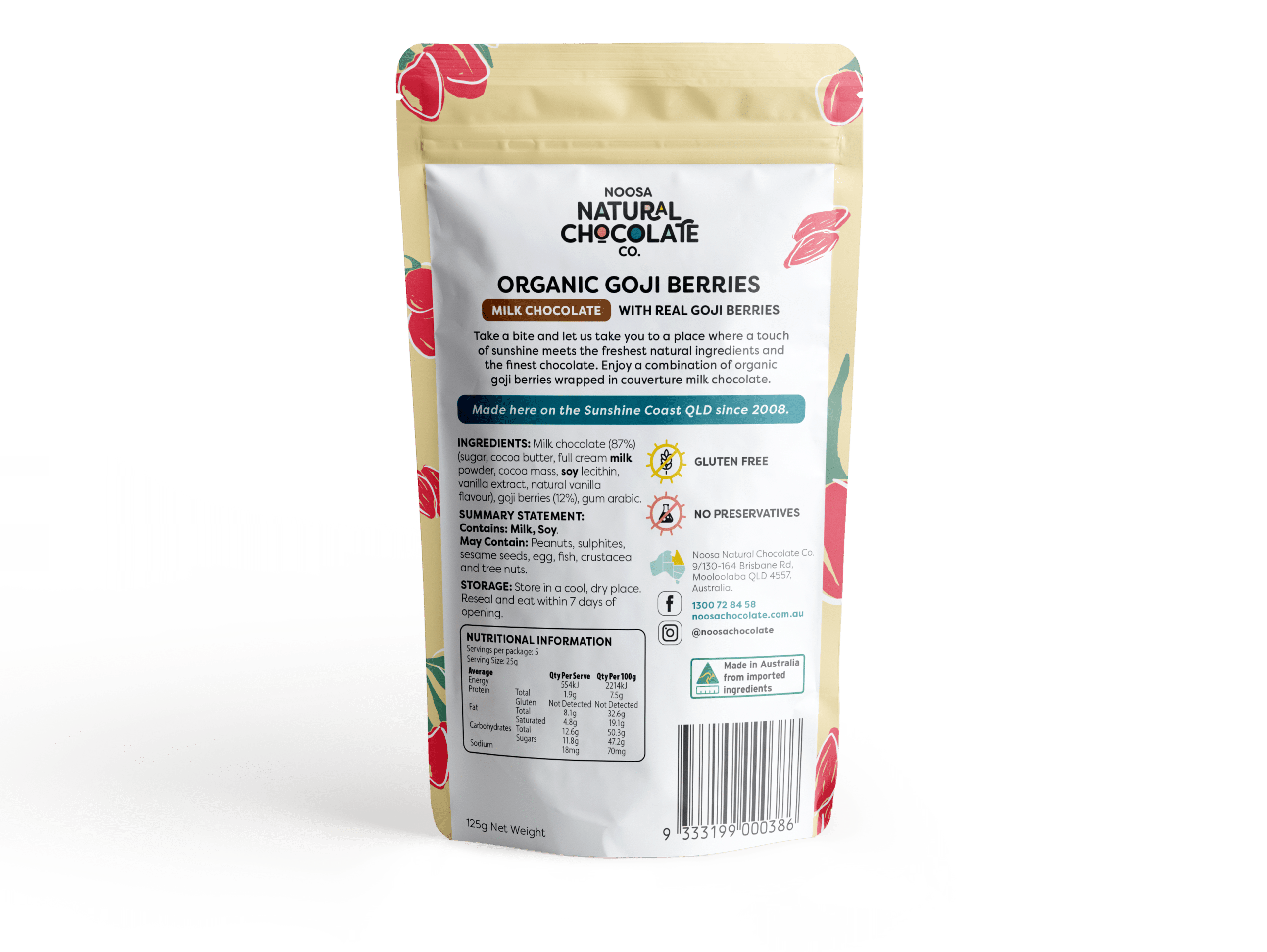 Milk chocolate (87%) (sugar, cocoa butter, milk solids, cocoa mass, soy lecithin, natural vanilla flavouring), goji berries (12%), glazing agent.