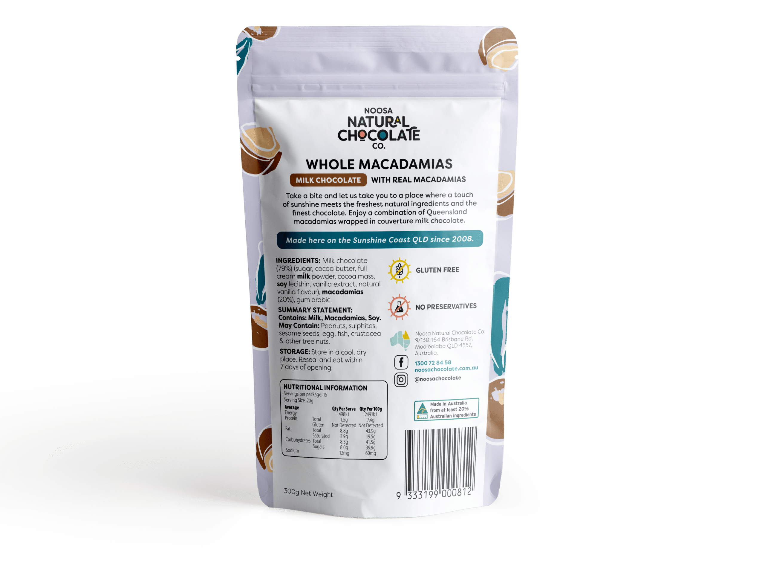 Milk chocolate (79%) (sugar, cocoa butter, milk solids, cocoa mass, soy lecithin, natural vanilla flavouring), macadamias (20%), glazing agent.