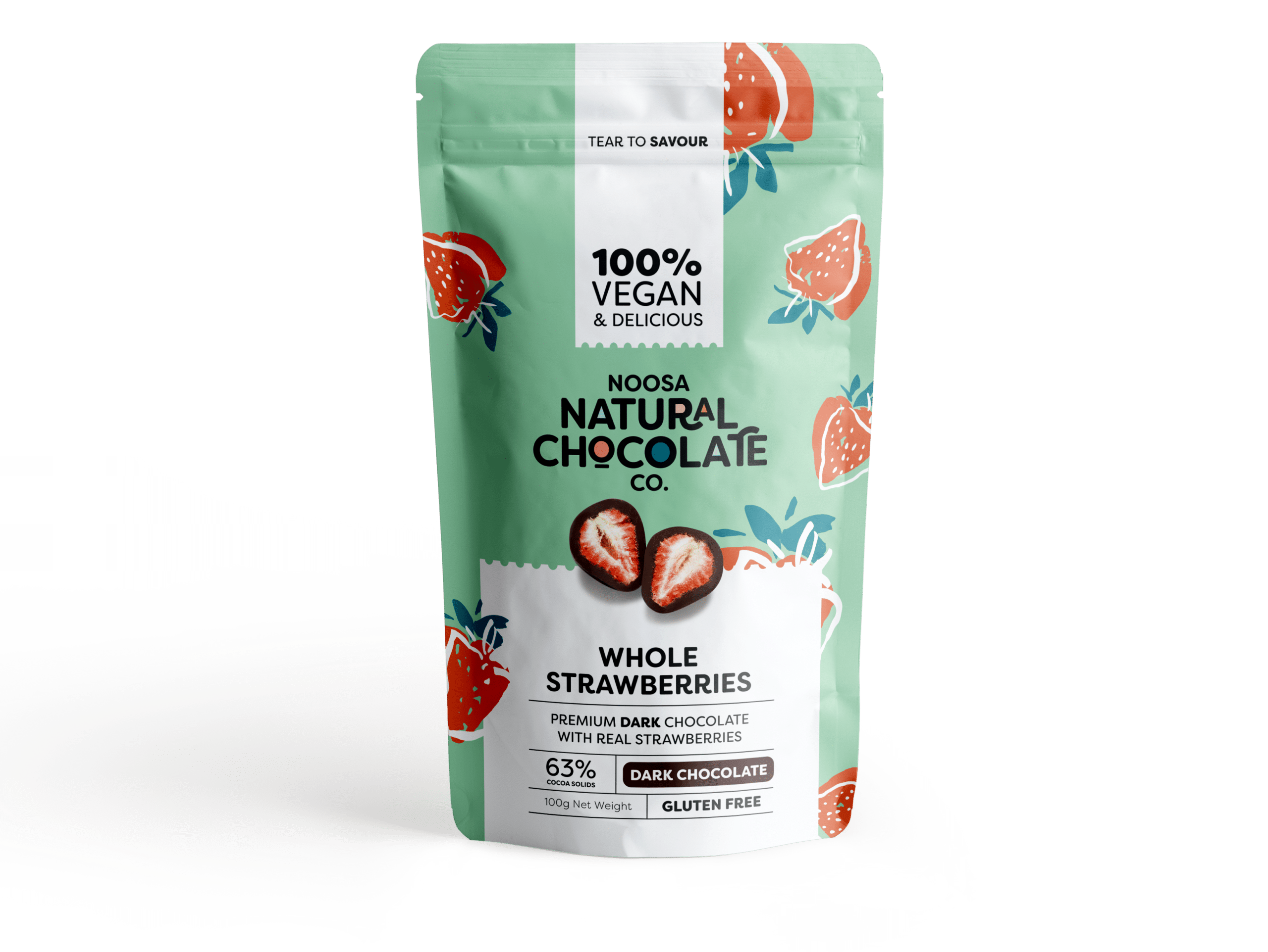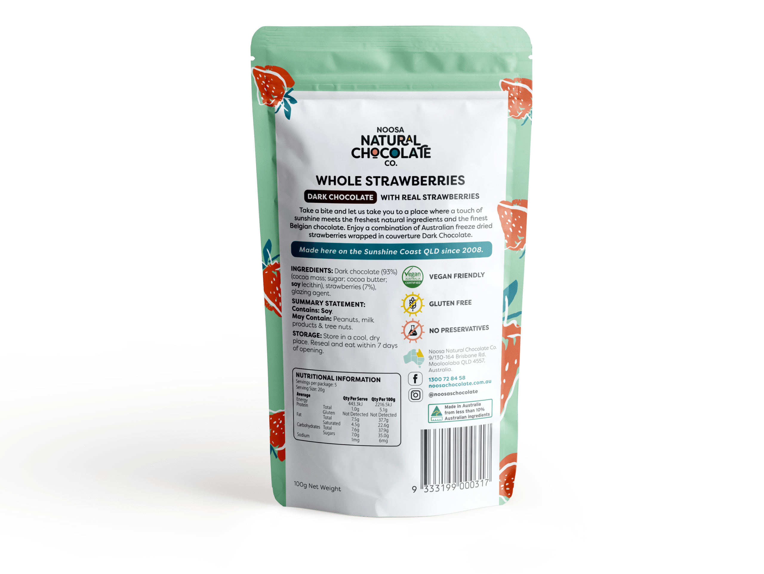 Dark chocolate (93%) (sugar, cocoa butter, cocoa mass, soy lecithin), strawberries (7%), glazing agent.
