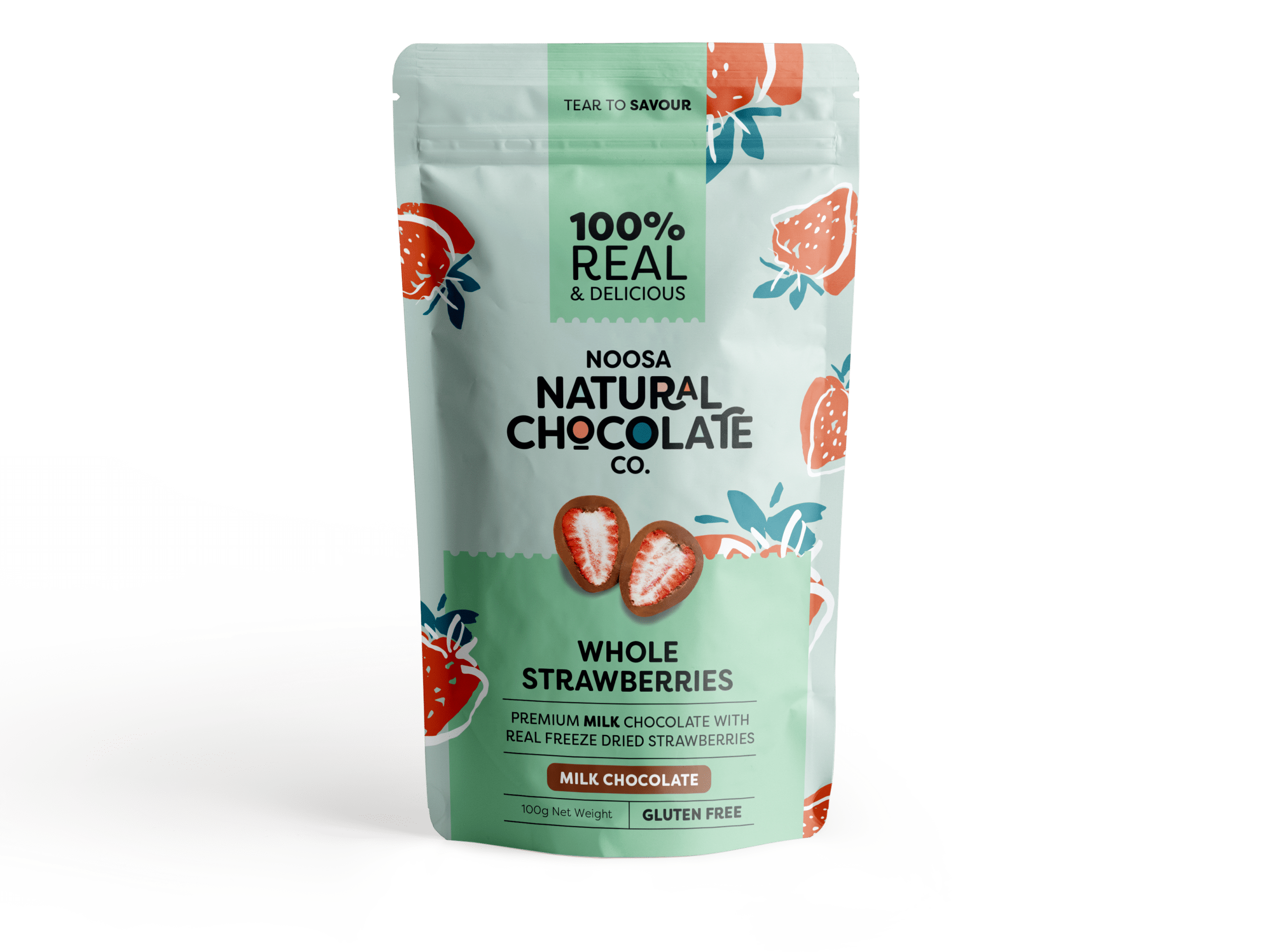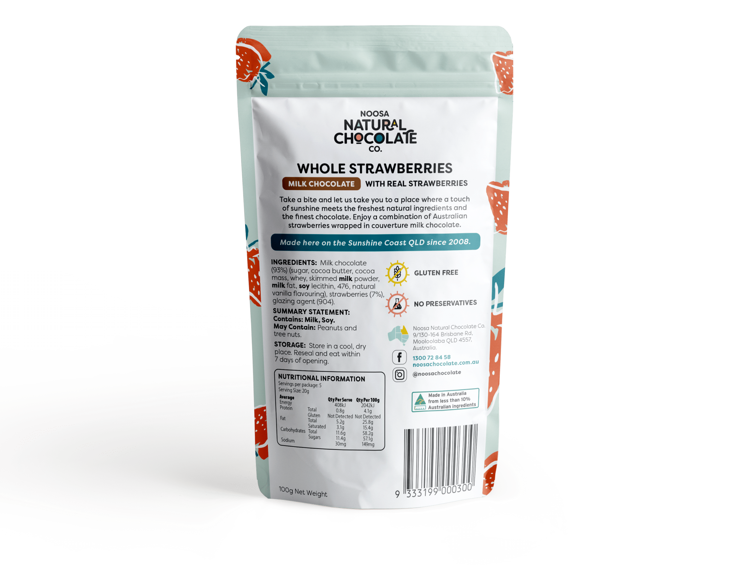 Milk Chocolate (93%) (sugar, cocoa solids, cocoa butter, milk solids, soy lecithin, emulsifier (476), natural vanilla flavouring), strawberries (7%), glazing agent.