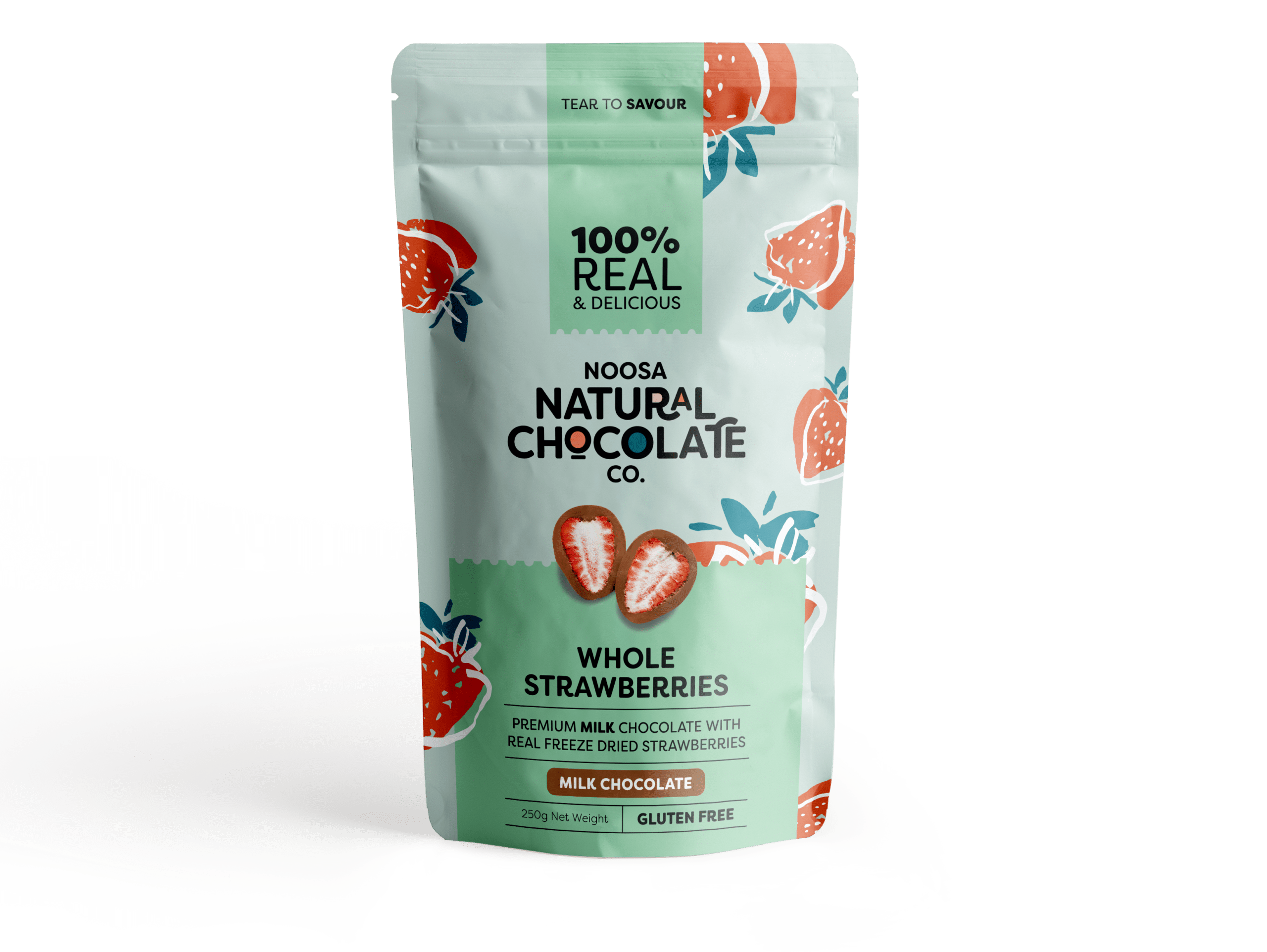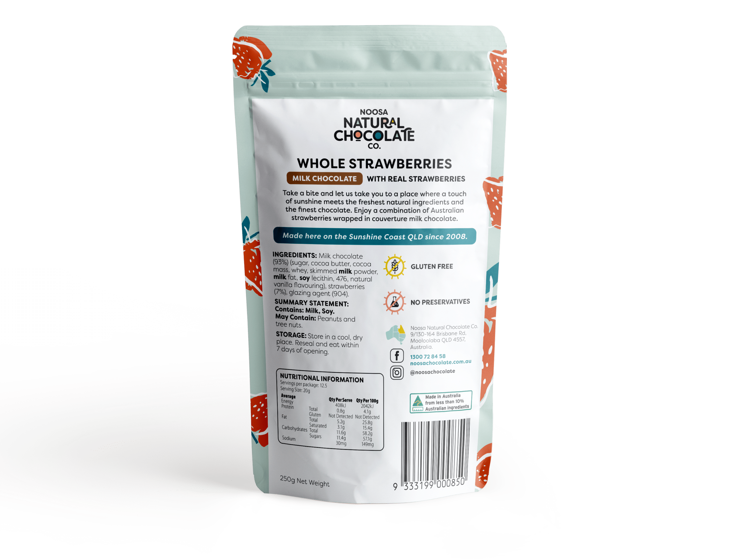 Milk Chocolate (93%) (sugar, cocoa solids, cocoa butter, milk solids, soy lecithin, emulsifier (476), natural vanilla flavouring), strawberries (7%), glazing agent.