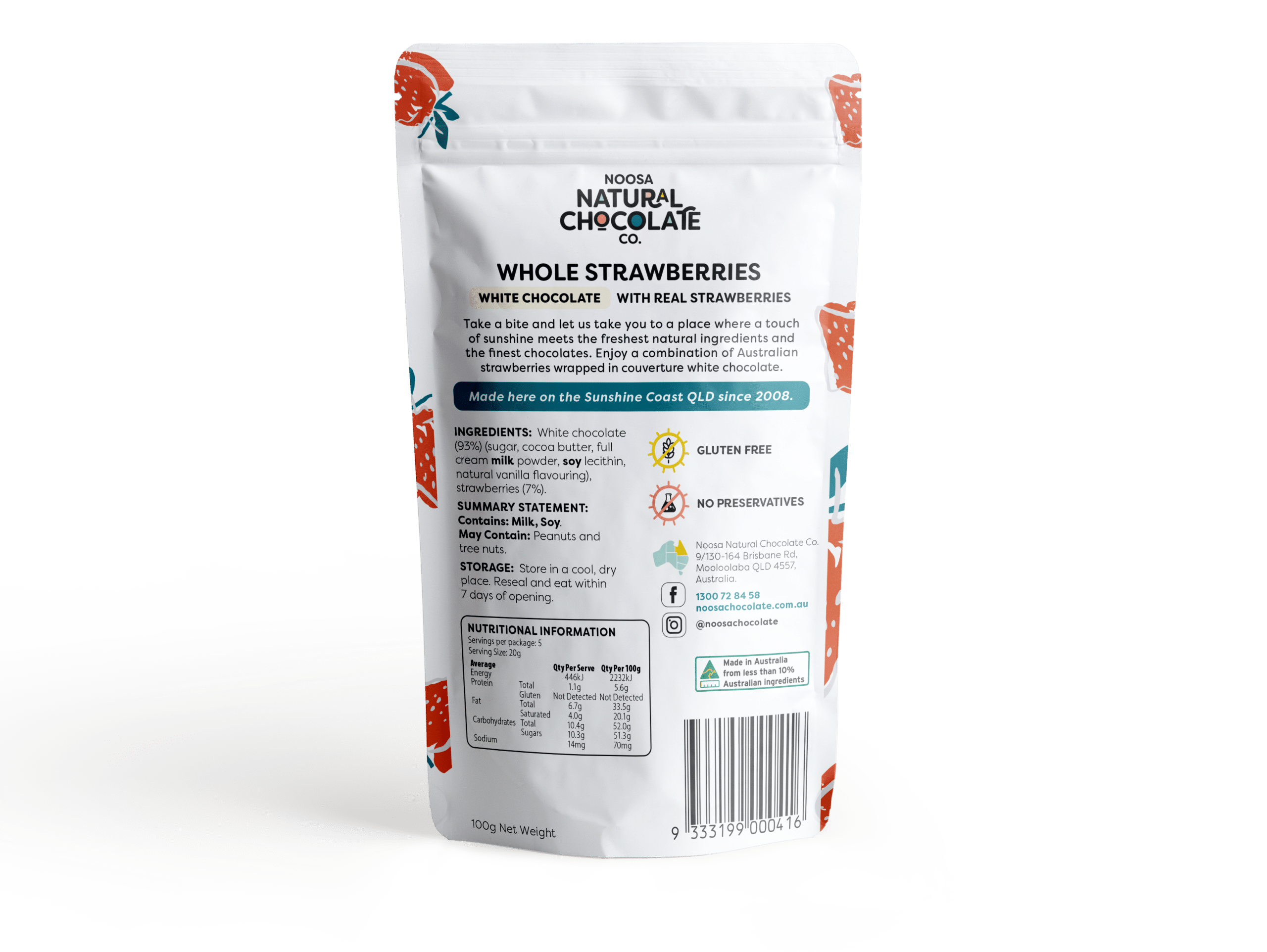 White Chocolate (93%) (sugar, milk solids, cocoa butter, soy lecithin, natural vanilla flavouringing), strawberries (7%)